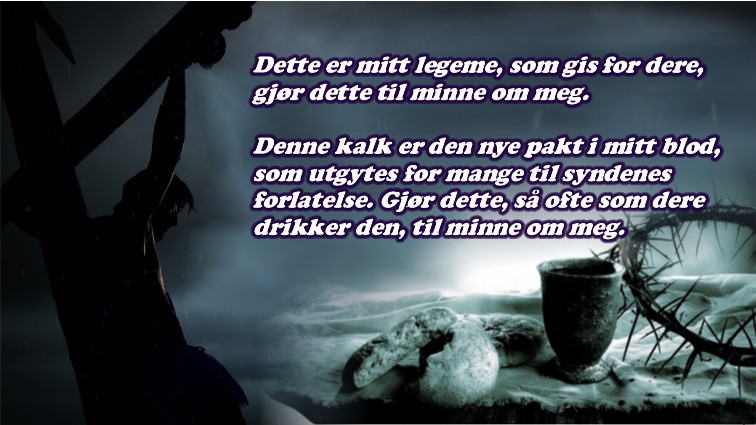 Og han tok en kalk, takket og sa: “Ta dette og del det mellom dere! For jeg sier dere: Fra nå av skal jeg aldri mere drikke av vintreets frukt før Guds rike er kommet. Og mens de åt, tok han et brød, takket, velsignet og brøt det, gav dem og sa: Ta det, et. Dette er mitt legeme, som gis for dere; gjør dette til minne om meg.”