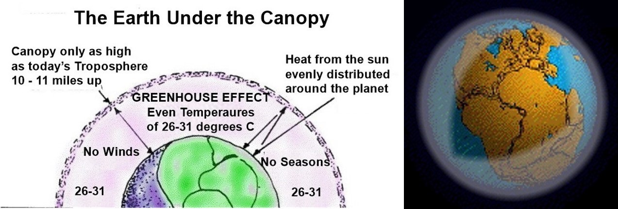 I begynnelsen skapte Gud et skydekke i troposfæren, “over himmelen”. Deretter samlet Gud vannet under hvelvingen (himmelen) “til ett sted”, og det tørre land ble synlig (1Mos 1:6-10). Fra skapelsen av var det altså et skydekke over himmelen, (“vannet som er over himmelen”) som omga hele jorden. Dette skapte en drivhuseffekt over hele jordkloden og kan forklare hvorfor det var tropisk klima på Svalbard og de arktiske områder. Det kan også forklare hvorfor mammuter som har blitt bevart i permafrosten i Sibir, har tropisk vegetasjon i magen.