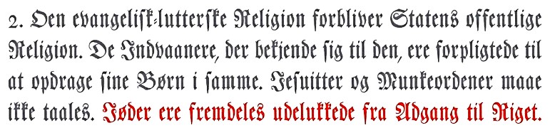 Da Eidsvollsmennene vedtok Den norske grunnloven i 1814, var det bare én folkegruppe som ble nektet adgang til Norge: Jødene. Flere av Eidsvollsmenn var fremtredende teologer og kirkeledere. Grunnloven av 1814, paragraf 2, fjerde punktum, lød slik: «Jøder ere fremdeles udelukkede fra Adgang til Riget.»
