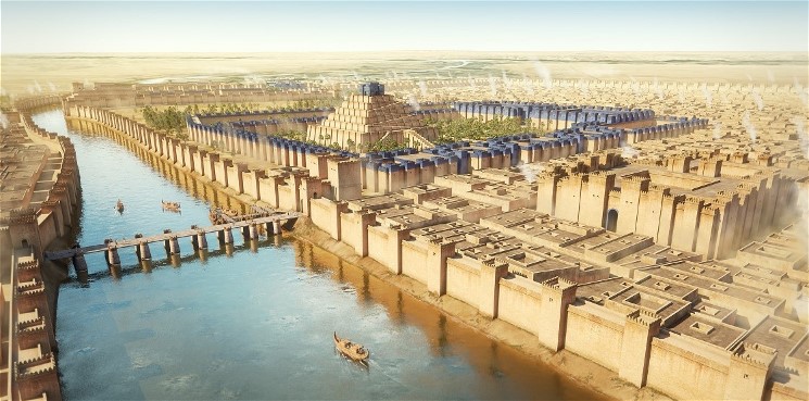 Arkitektonisk rekonstruksjon av Babylon, slik byen kunne ha sett ut på profeten Daniels tid. I sentrum av bildet ses etemaki (ziggurat), og esagila (Marduks tempel) til høyre for etemaki. Marduk var Babylons skytsgud (ref. Associates for Biblical Research).