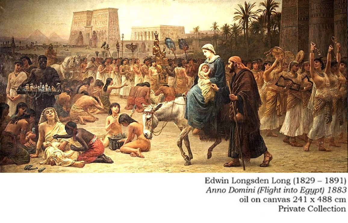 Bildet over viser et maleri med tittelen Anno Domini, malt av den britiske kunstneren Edwin Long (1829 – 1891). Maleriet viser Josef og Maria med Jesus-barnet og deres ankomst til Egypt etter å ha flyktet fra Betlehem da Herodes ville drepe alle guttebarn i Davids by som var under 2 år. Edwin Long er kjent for sine historiske malerier fra Levanten, Midtøsten og Egypt. Hans verker inkluderer kjente malerier som The Babylonian Marriage Market (1875); The Finding of Moses (1886); og Queen Ester (1878). På maleriet Anno Domini ser det ut som Long har forestilt seg Jesus som godt over stadiet som nyfødt. Jesus må ha vært nesten 2 år gammel da denne hendelsen fant sted.