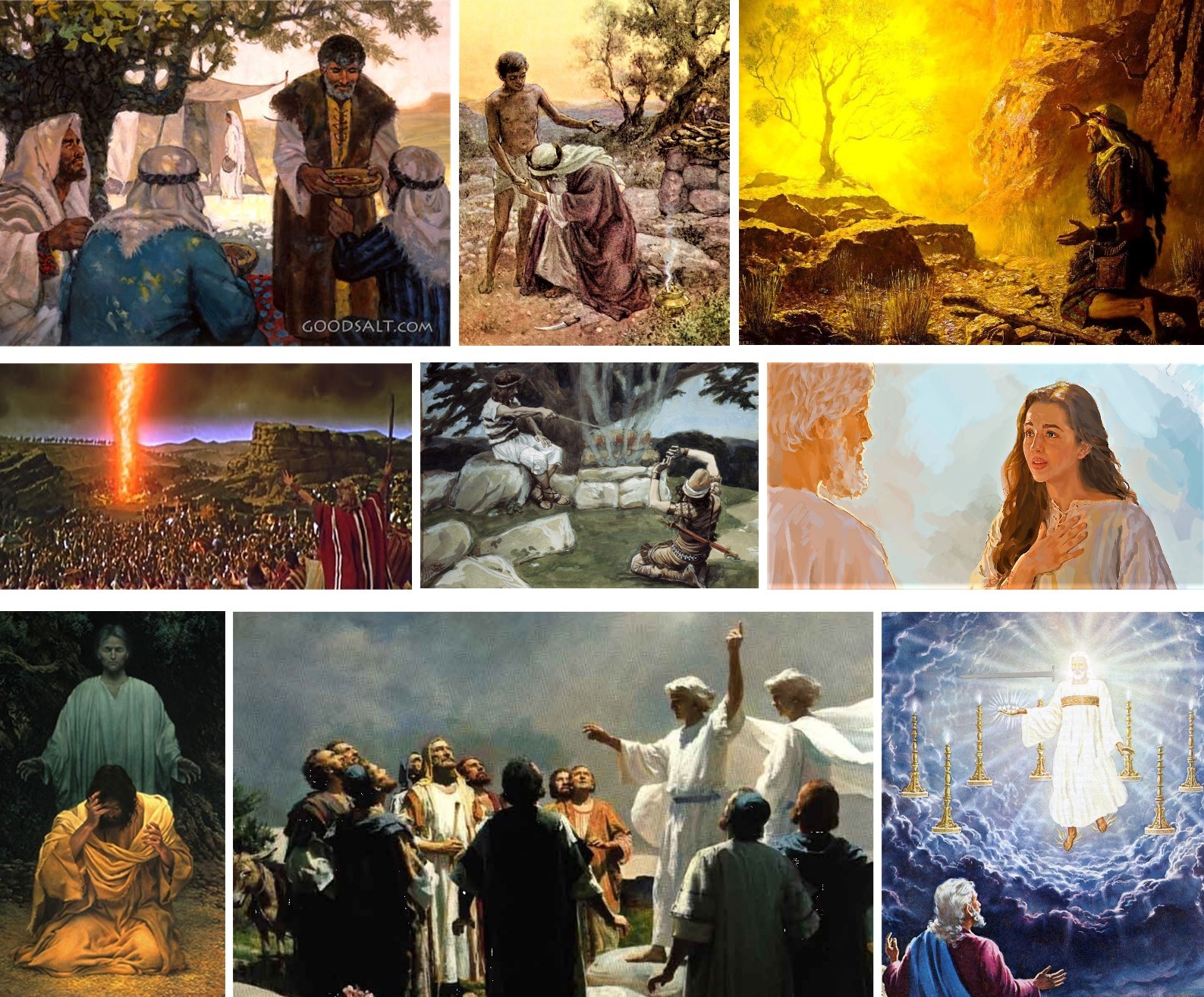 Første rekke: Abraham får besøk av tre menn, som er engler; En engel ropte fra himmelen til Abraham og stoppet offer-ritualet; En engel viser seg for Moses som en brennende busk.